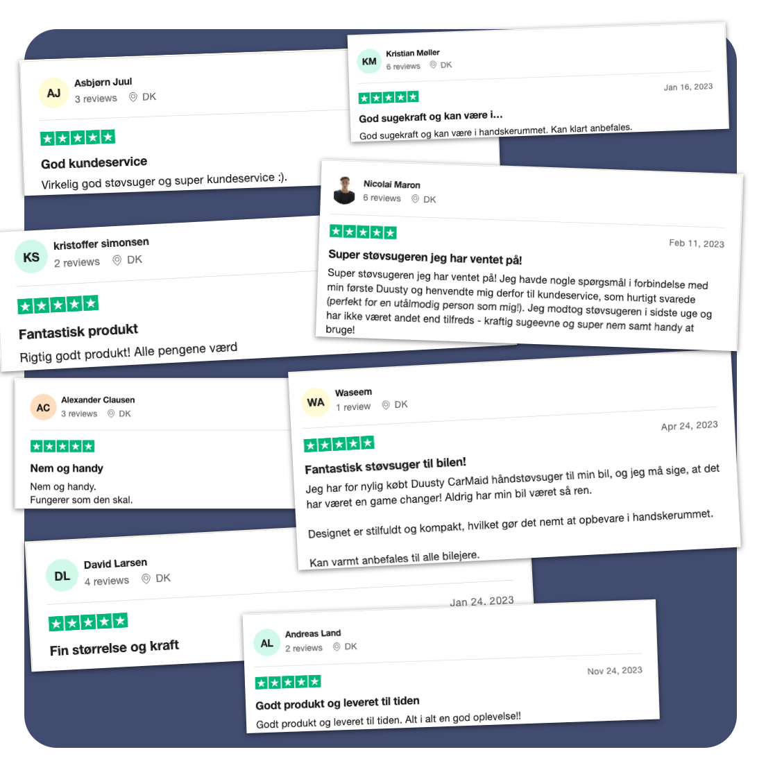 Vores 100 dages tryhedsgaranti kan ses som en prøveperiode, hvor du har mulighed for, at få støvsugeren hjem og prøve den i din bil. Hvis det indenfor garantiperioden viser sig, at støvsugeren ikke er noget for dig, skal du blot række ud til os på hej@duusty.dk og igangsætte en returproces. Her sørger vi for at sende dig et returlabel, som du kan bruge til at sende pakken retur til os, hvorefter vi sender alle pengene retur til dig.